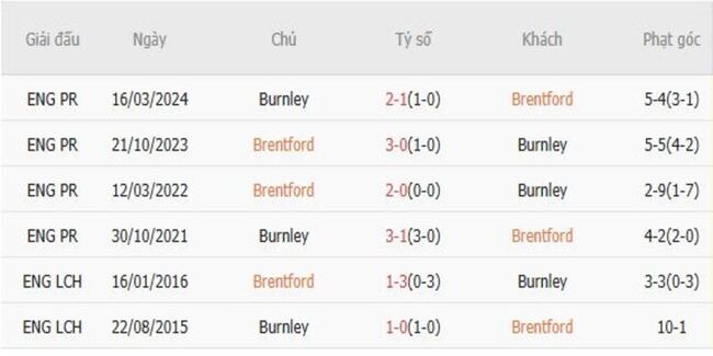 Thành tích đối đầu quá khứ giữa Brentford vs Burnley