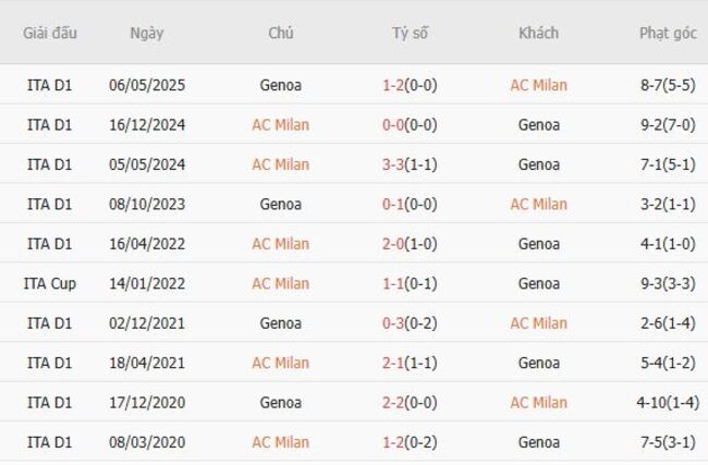 Thành tích đối đầu quá khứ giữa AC Milan vs Genoa