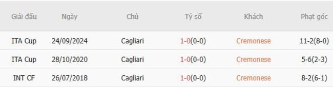 Thành tích đối đầu quá khứ giữa Cremonese vs Cagliari