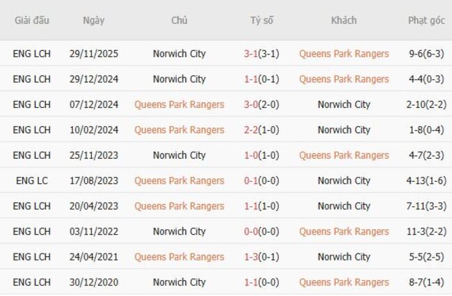Thành tích đối đầu quá khứ giữa QPR vs Norwich City