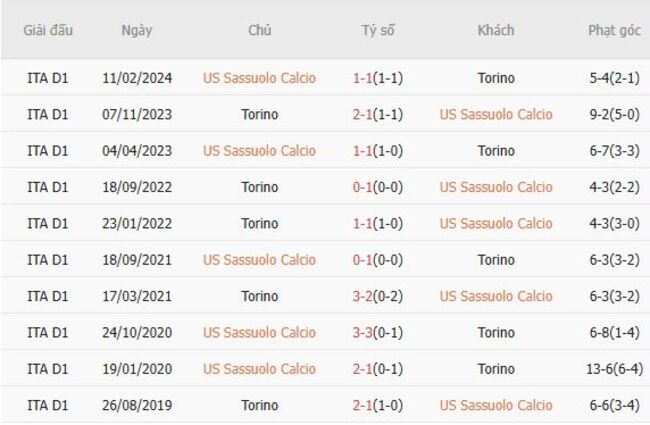 Thành tích đối đầu quá khứ giữa Sassuolo vs Torino