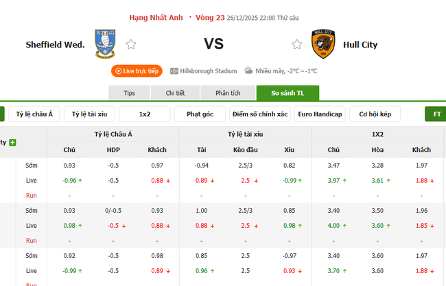 Tỷ lệ kèo Sheffield Wednesday vs Hull City