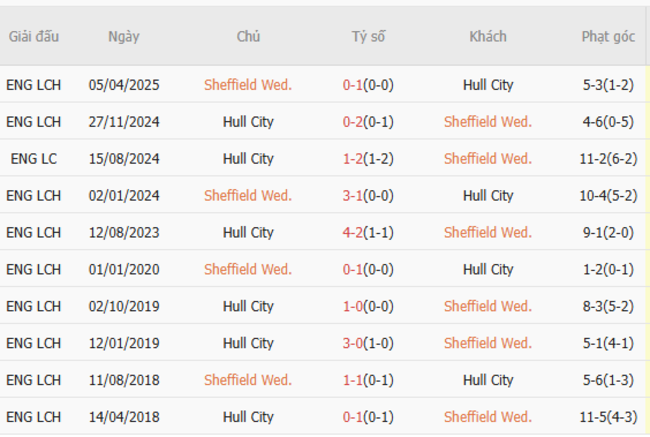 Thành tích đối đầu quá khứ giữa Sheffield Wednesday vs Hull City