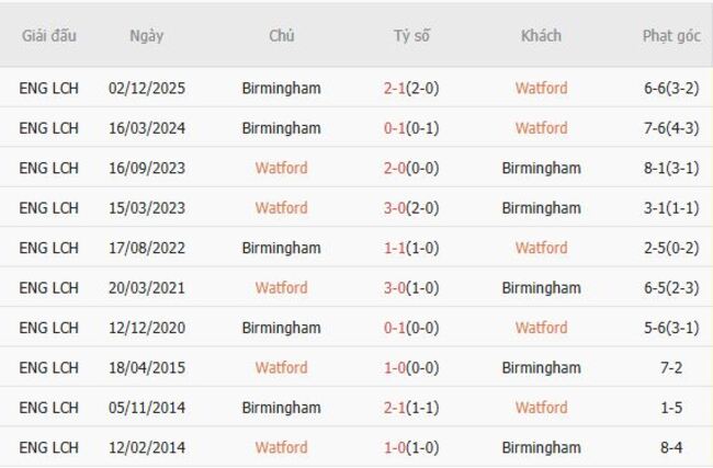 Thành tích đối đầu quá khứ giữa Watford vs Birmingham